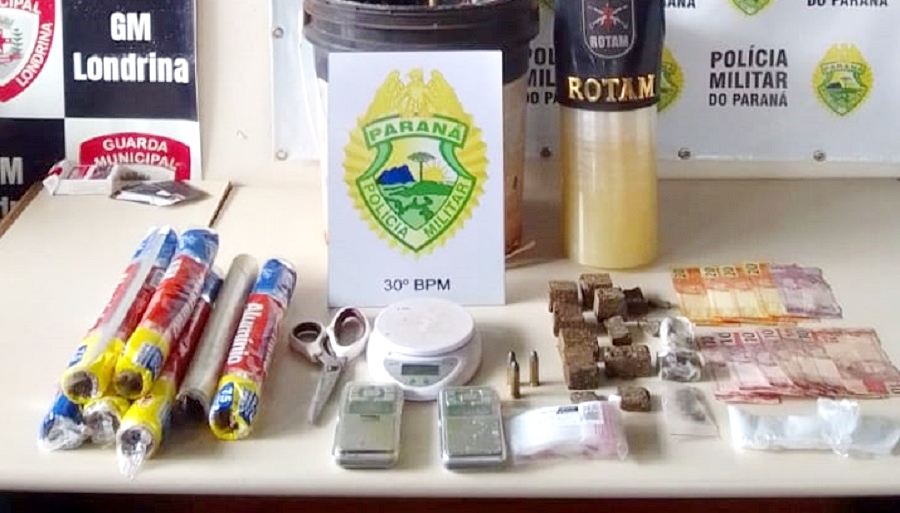 No local foram apreendidos um pé de maconha, tabletes da droga, pouco mais de R$ 150 em dinheiro e vasto aparato para pesagem e porcionamento do entorpecente – entre eles três balanças de precisão, rolos de papel alumínio, tesoura, gilete e até munições para calibre 38.