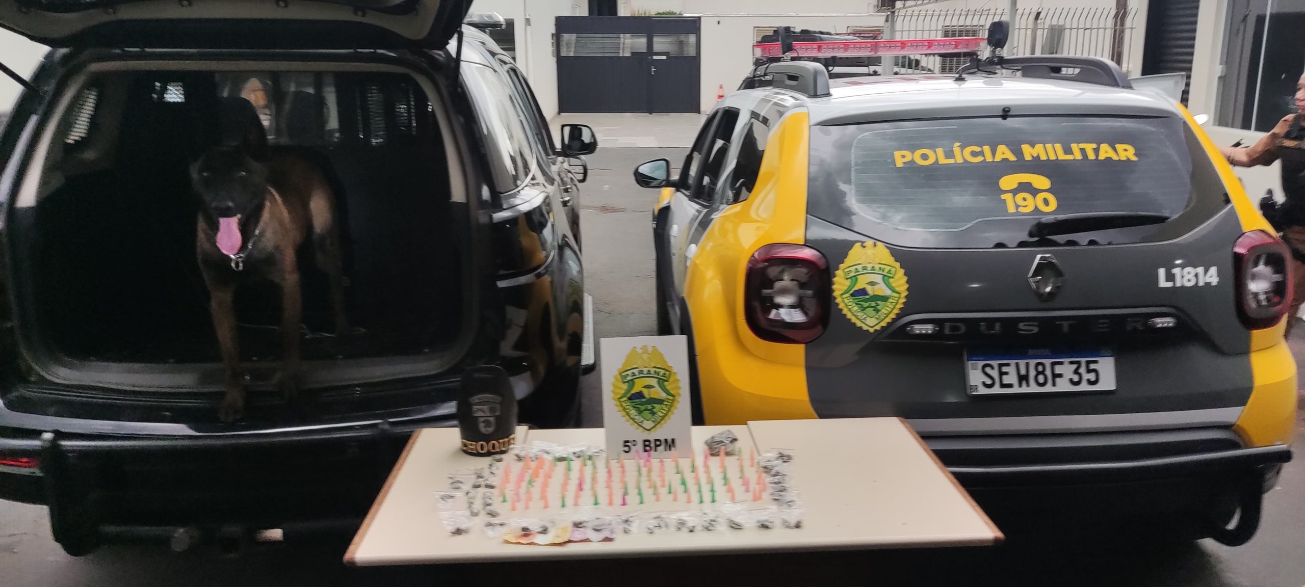 Três suspeitos foram detidos no Conjunto União da Vitória, em Londrina, pelos crimes de tráfico de drogas e associação ao tráfico. Equipe da Polícia Militar, juntamente com o cão farejador Hambal, conseguiram deter os dois adultos e um adolescente na Rua dos Agrônomos. A ação foi a partir de uma denúncia anônima. Apesar do trio tentar dispersar do flagrante, eles acabaram responsabilizados pelas porções de cocaína e maconha escondidas nas imediações.