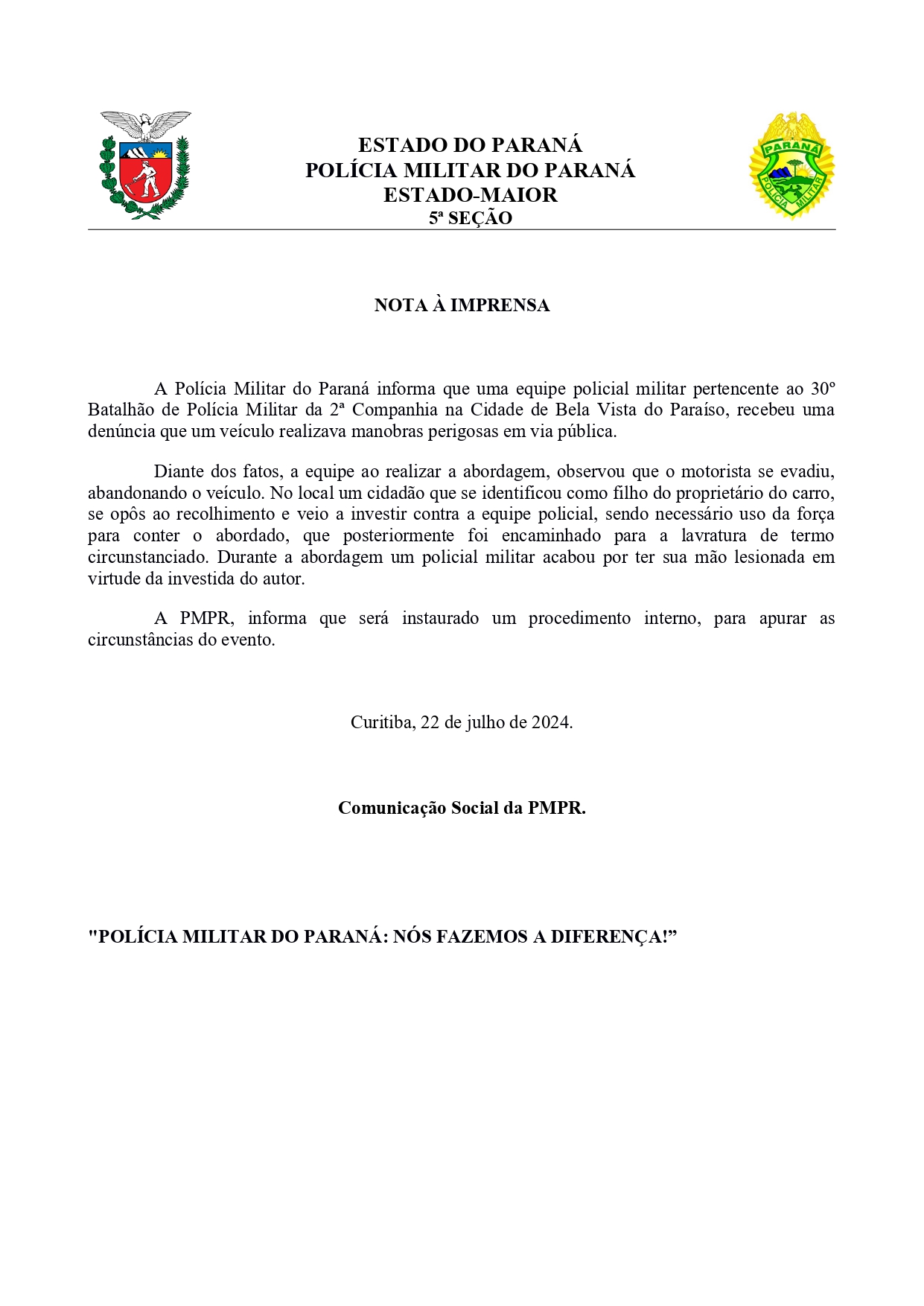 Ainda de acordo com a PM (veja nota abaixo), foi necessário o auxílio de outra viatura, para conter o motorista do veículo, já que outras pessoas também tentaram intervir e que “vai instaurar um procedimento interno, para apurar as circunstâncias do evento”.