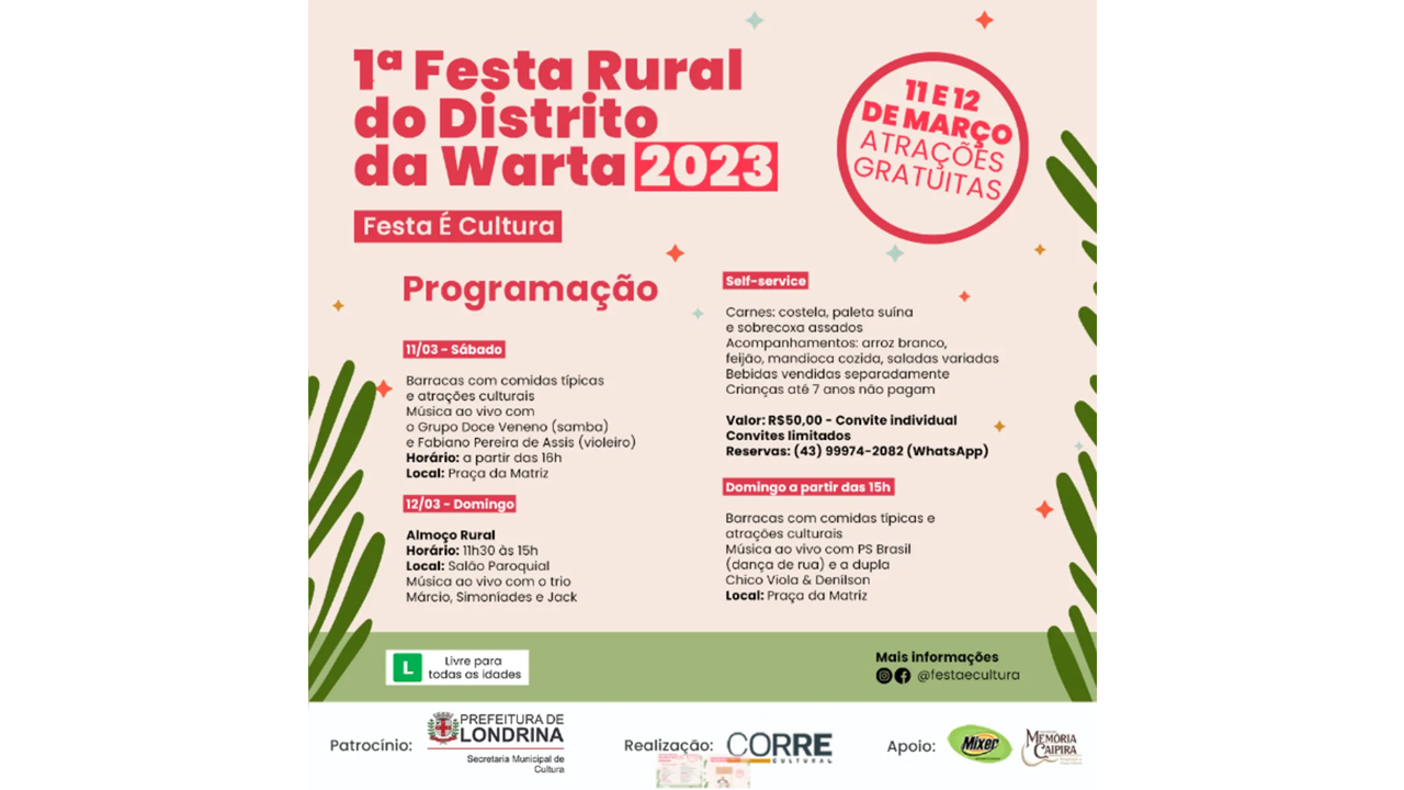 Neste fim de semana, nos dias 11 e 12, será realizada a 1ª Festa Rural do Distrito da Warta, na Praça da Igreja Matriz. O evento é apoiado pela Secretaria de Cultura de Londrina e marca a retomada das festas rurais.